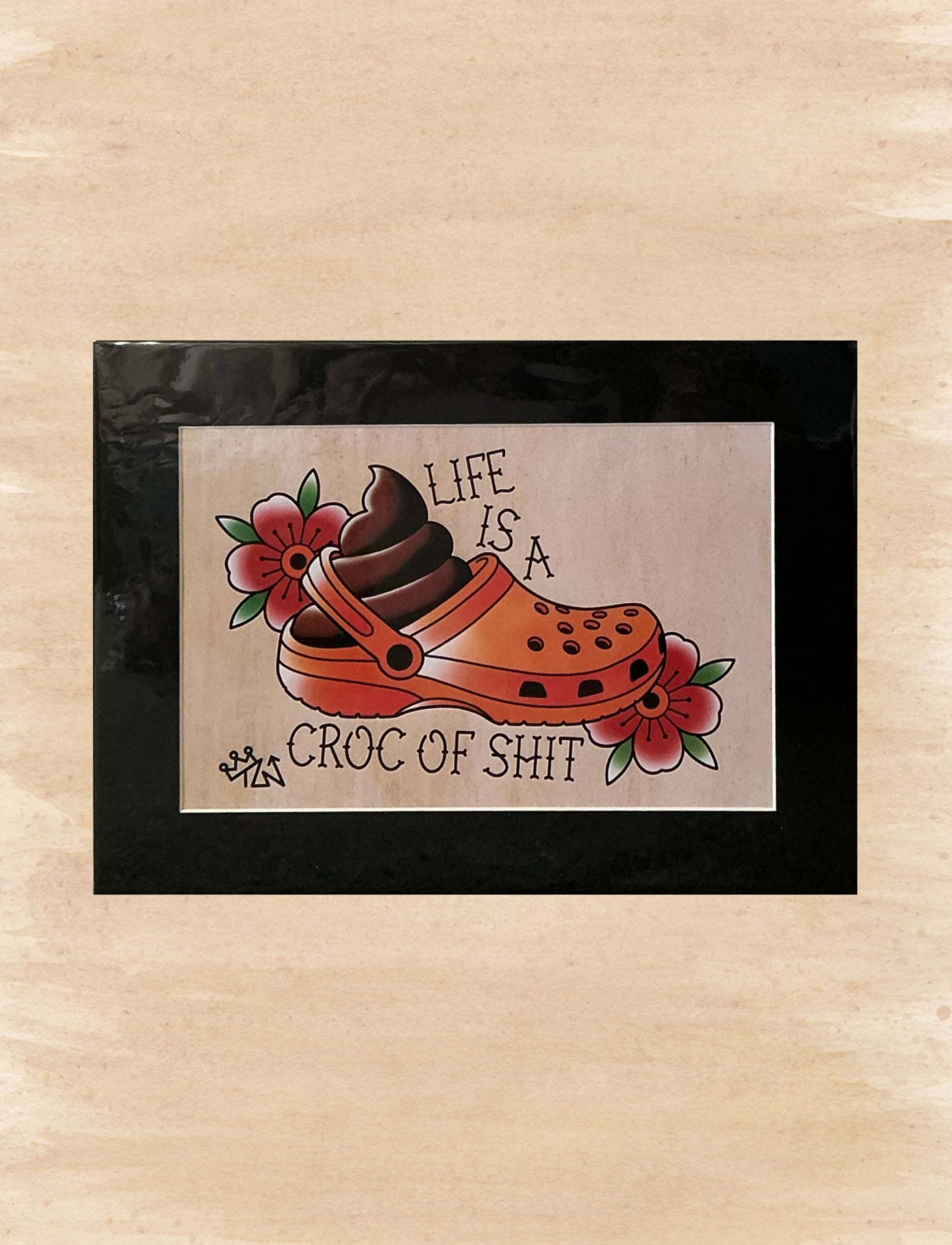 Bold, ridiculous, and guaranteed to get a laugh- this print of “Life’s a Croc” takes classic tattoo flash humor to the next level. Featuring an orange Croc with a cartoon poop swirl sitting inside and the phrase “Life is a Croc of Shit”, this piece blends playful irreverence with clean traditional-style line work and vibrant colours.