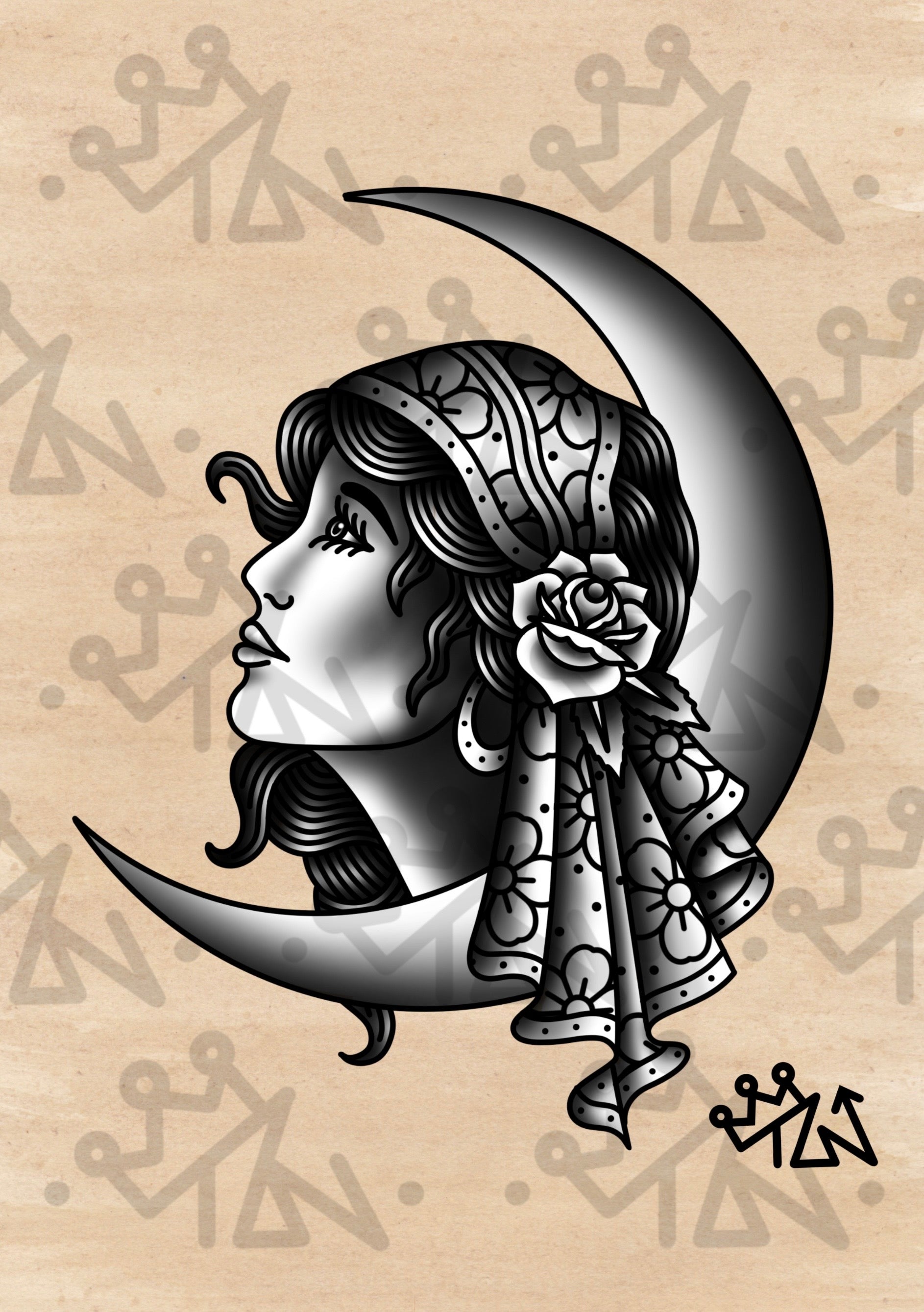 “Moon Lady” captures a serene feminine profile framed by a sweeping crescent moon. Rendered in smooth black and grey tones, this piece draws heavily from traditional tattoo flash while introducing a softer, more refined aesthetic.