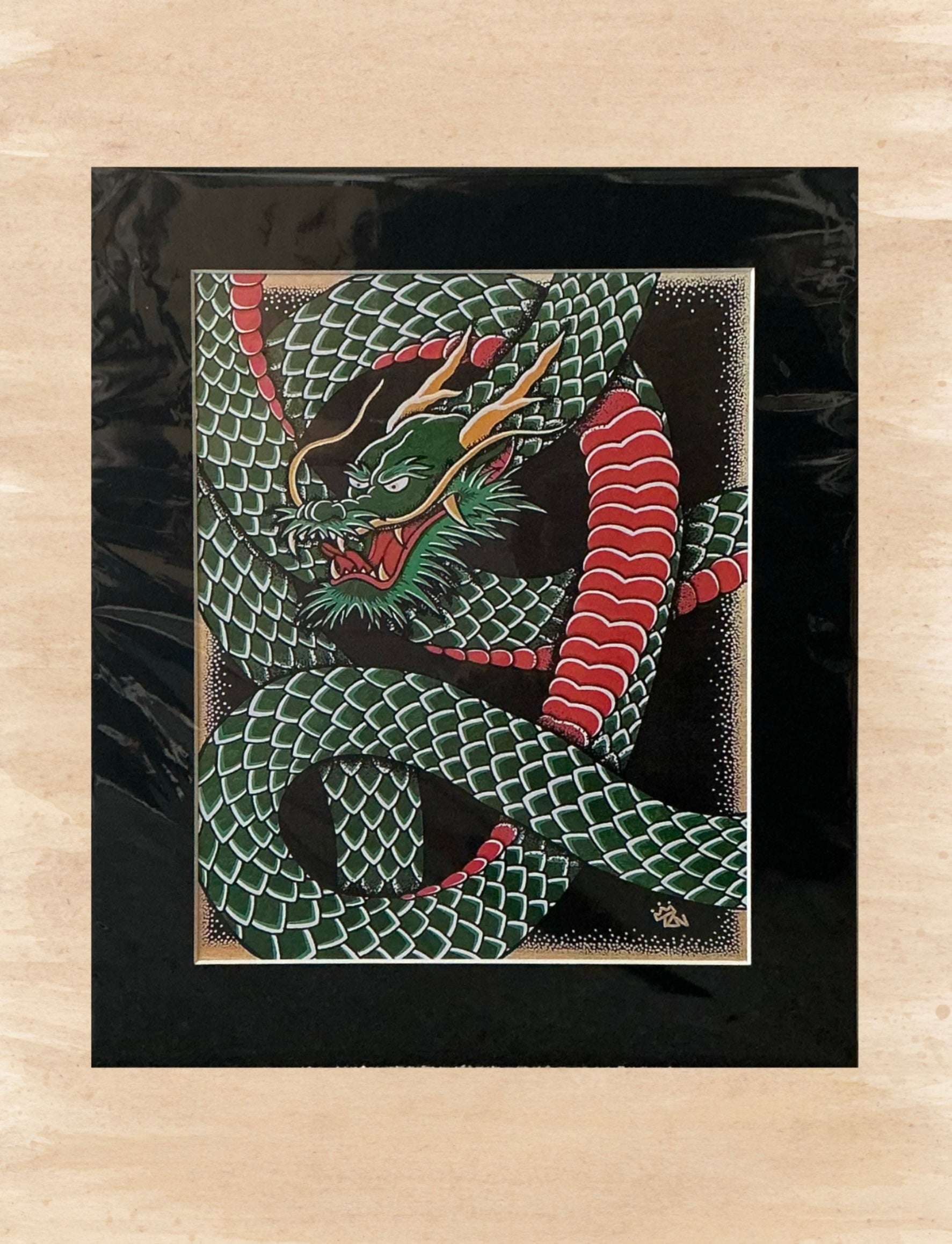 This print of “Redemption” brings the strength and spirit of the dragon into your space. Featuring a fierce green dragon with golden horns, fiery red scales, and intricate detailing, this piece captures the timeless energy of Japanese-inspired tattoo art. The bold contrast of rich colours against a deep black background makes the dragon appear alive, coiled in motion, and ready to strike.